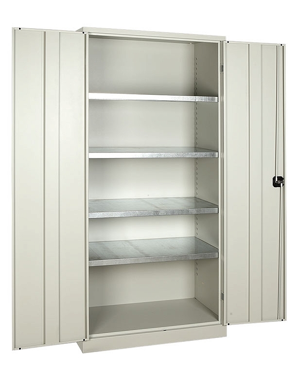 Kovová skříň svařovaná z ocelového plechu. Rozměry v x š x h = 1950 x 920 x 500 mm. Police z pozinkovaného plechu - odolné vůči poškrábání na rozdíl od podobných výrobků s policemi lakovanými. Dvoudveřová s vyztuženými křídly dveří, vnitřní závěsy, úhel otevření křídel dveří 180°. Uzavírání 2 bodovým rozvorovým mechanismem + cylindrický značkový zámek Ronis, 2 klíče. Výbava 4 police, nosnost 60 kg, výšková přestavitelnost v kroku 35 mm. Lze objednat přídavné police - cena bez DPH 460,- Kč/ks. Povrchová úprava práškovou epoxidovou barvou, šedá RAL 7035. Záruka 5 let.