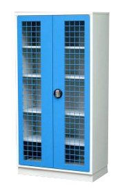 • kvalitní povrchová úprava práškovými interiérovými barvami, šedé těleso skříně včetně polic (RAL 7035) a modré dveře (RAL 5015)