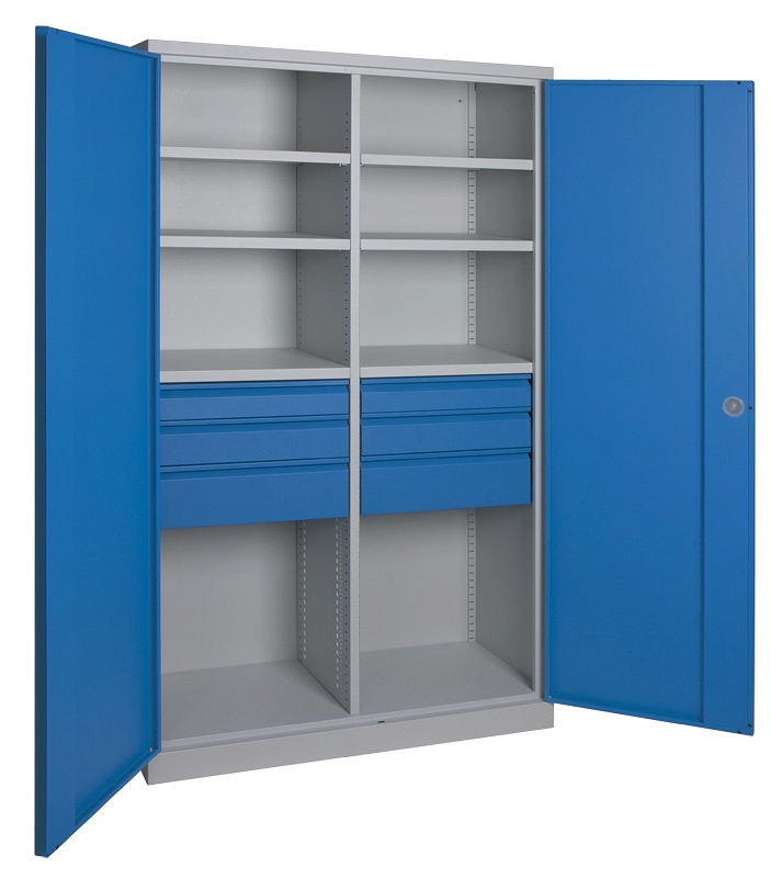 Robustní svařovaná skříň ideální pro použití ve všech průmyslových provozech. Plně svařovaný korpus skříně z ocel. plechu tl. 0,9-1 mm, nosnost korpusu 1000 kg. Vnější rozměry š x v x h = 1200 x 1950 x 450 mm. Vnitřní nosná dělící přepážka, police - 6ks, nosnost 100 kg, 6 ks - svařované zásuvky na kuličkových ložiskách, výsuv 100%, průběžné madlo, nosnost 50 kg (další zásuvky lze dokoupit a namontovat i později), výška čel zásuvek 6 x 118/105 mm. Výška polic 30 mm. Police i zásuvky jsou stavitelné v rastru 25 mm, vyztužené dveře se skrytými závěsy, uzamykání cylindrickým zámkem (2 klíče) + 2-bodovým rozvorovým mechanismem. Práškový epoxidový lak se zvýšenou odolností vůči oděru, barva šedá/modrá RAL 7035/5015. Záruka 3 roky.