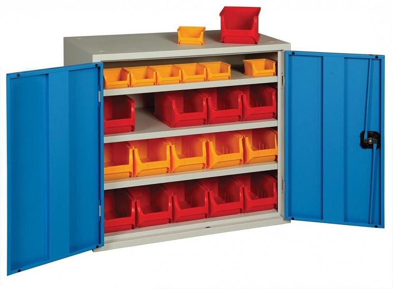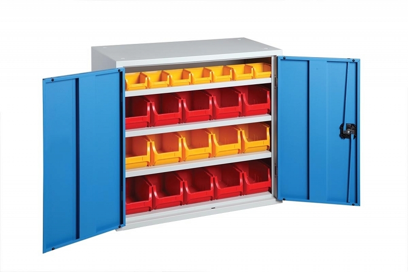 Dvoudveřová s vyztuženými křídly dveří s vnitřními závěsy, úhel otevření 180°. Uzavírání bezpečnostním pákovým rozvorovým mechanismem, cylindrický značkový zámek Ronis, 2 klíče. 3 police, nosnost police 50 kg, výšková přestavitelnost v kroku 35 mm. Nosnost skříně 250 kg. Výbava skříně - 22 ks plastových boxů, vnější rozměry boxů - 15 ks v x š x h = 125 x 150 x 235 mm (vel. 3) + 7 ks - v x š x h = 60 x 102 x 100 mm (vel.1). Barvu boxů uveďte v objednávce - nabízíme je v barvách žlutý, modrý, červený, šedý a zelený. (nebude-li v objednávce specifikováno, dodáme boxy tak jak uvedeno na fotografii zboží resp. dle skladových zásob). Povrchová úprava skříně práškovou barvou, šedá/modrá RAL 7035/5015.